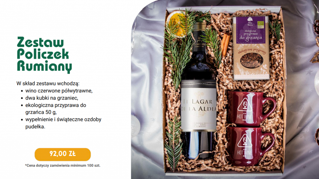 „Zestaw Policzek Rumiany” to doskonały wybór dla firm, które chcą podarować swoim klientom lub partnerom biznesowym coś niebanalnego, ciepłego i klimatycznego. Ten zestaw świąteczny wyróżnia się nie tylko estetycznym wykonaniem, ale przede wszystkim atmosferą, jaką wprowadza – idealną na zimowe wieczory. W eleganckim pudełku znajdują się czerwone, półwytrawne wino, dwa ceramiczne kubki z nadrukiem „Hot Wine” oraz ekologiczna przyprawa do grzańca. Całość uzupełnia świąteczne wypełnienie i dekoracyjne dodatki, takie jak gałązki świerku czy plasterki suszonych owoców, które tworzą naturalny klimat.